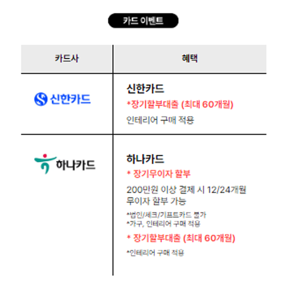- 2~3개월 무이자 카드(5만원 이상, 국내 결제 시) : 롯데카드, 하나카드, 현대카드, 국민카드, 신한카드, 삼성카드, 전북카드